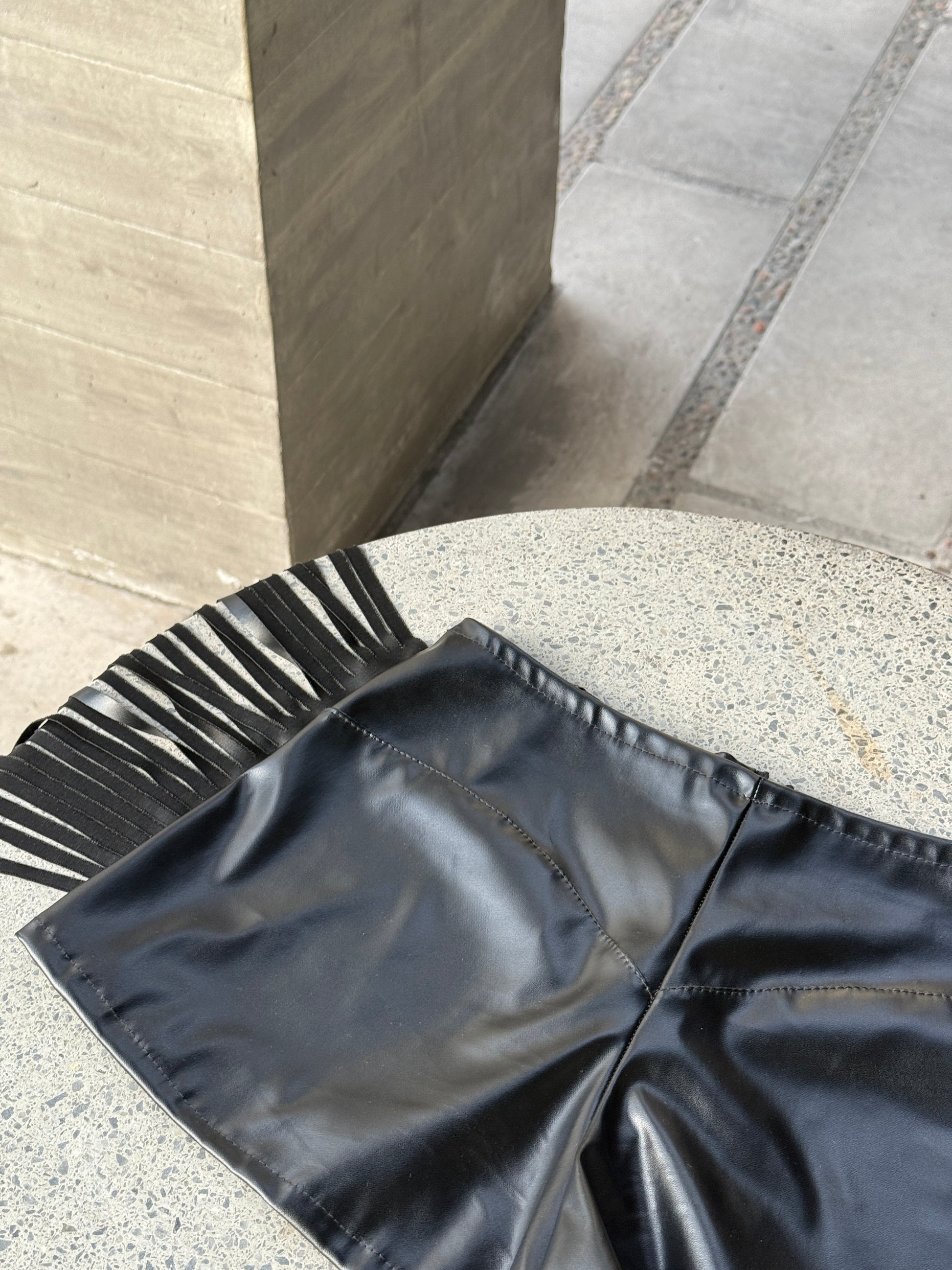 Short de ecocuero elasticado tiro medio, con tachas color Plata en la parte delantera, vuelos a los costados y cierre en la parte del medio.
